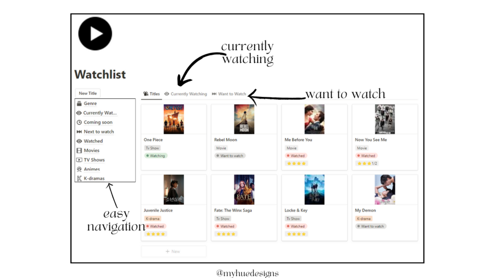 Track your watching activities, from movies, series, k-dramas, anime, and so on. The Notion watchlist template is about everything you've watched, you want to watch, or you dropped.