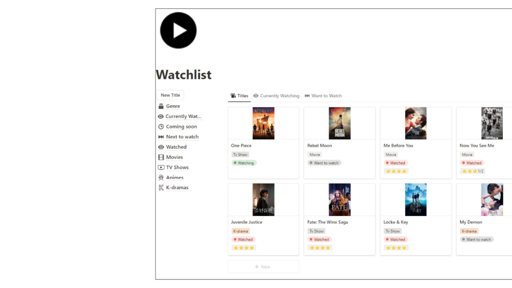 Track your watching activities, from movies, series, k-dramas, anime, and so on. The Notion watchlist template is about everything you've watched, you want to watch, or you dropped.